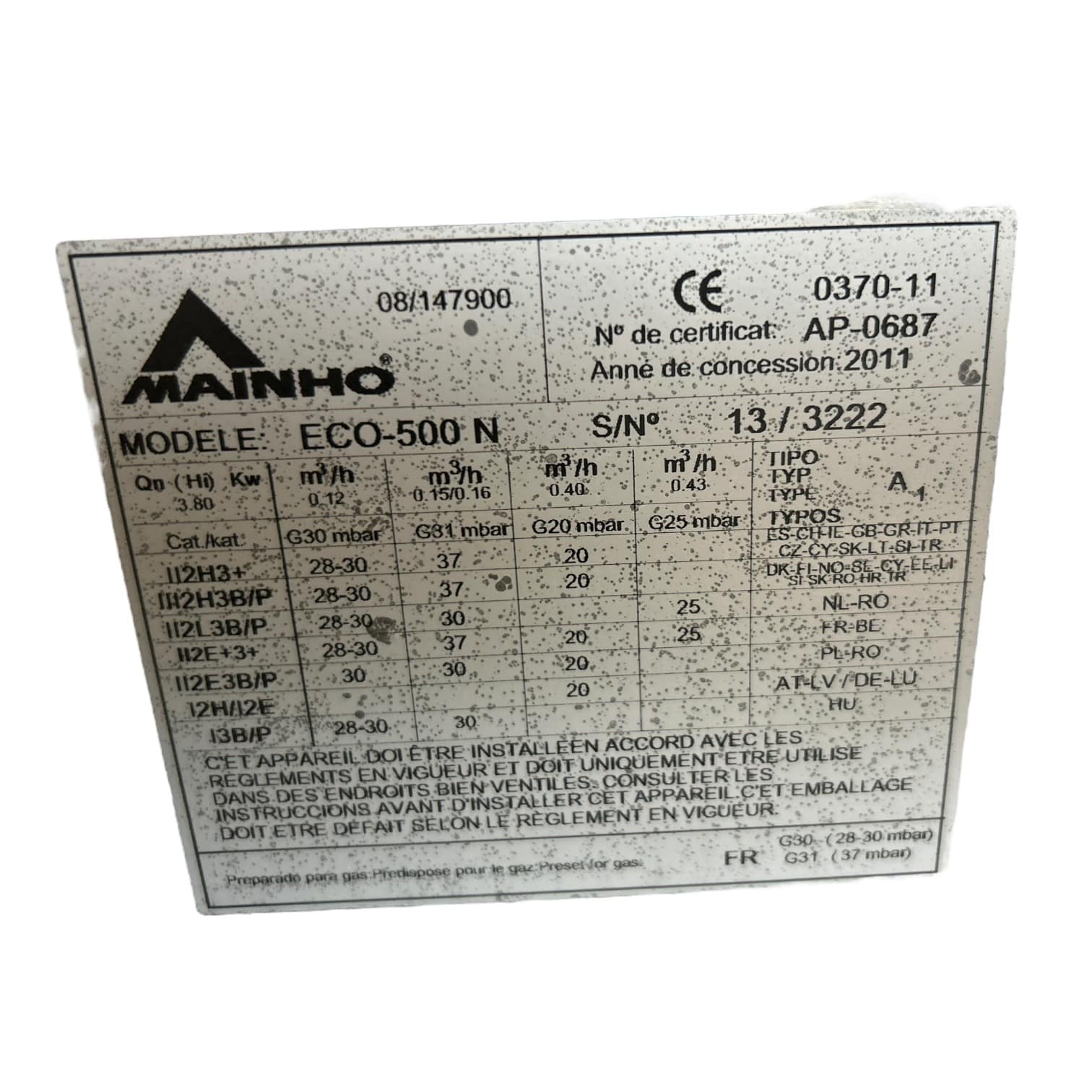 Type d’alimentation : Gaz (livrée d’origine Butane/Propane + injecteurs Gaz Naturel fournis)